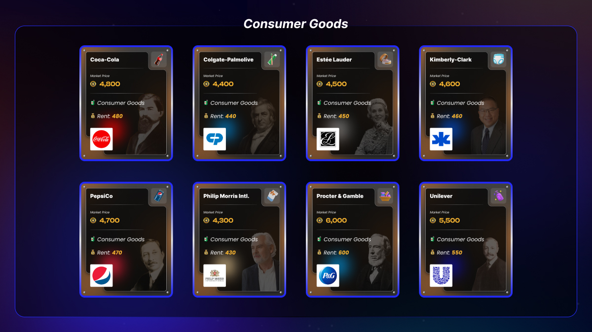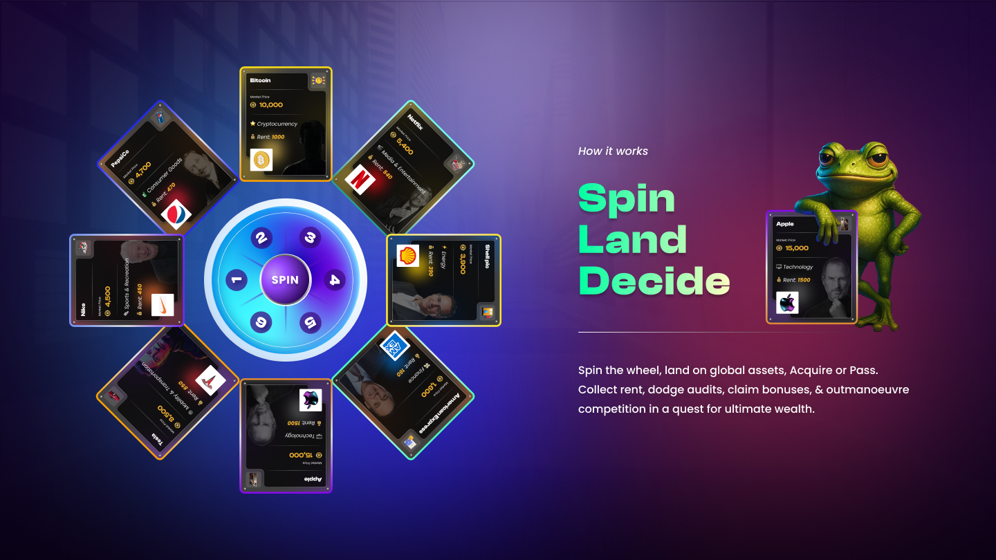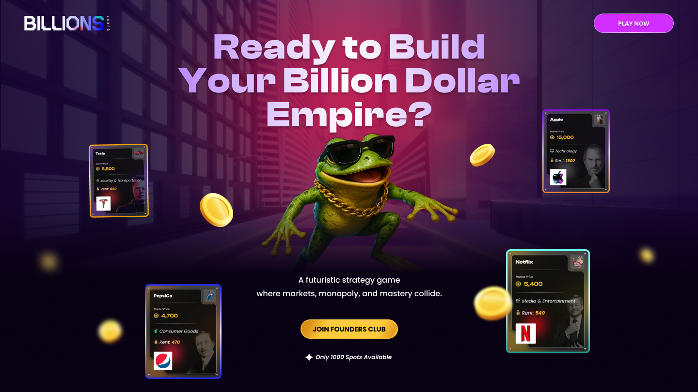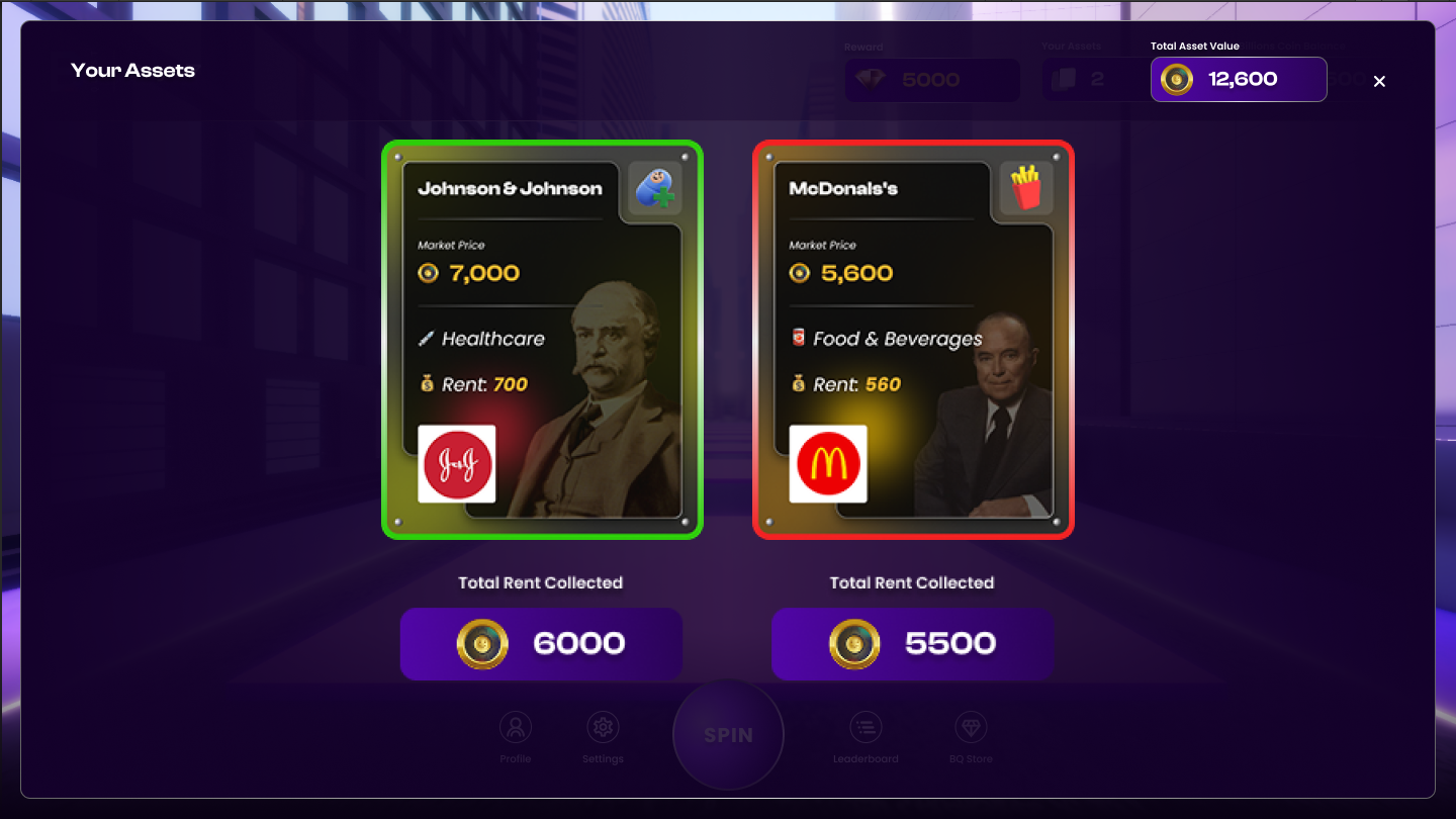 Billions Quest is a strategy game that combines the thrill of Monopoly-style board progression with real-time financial market dynamics.  Players move around 11 futuristic districts, each representing an industry such as Finance, Tech, Healthcare, Consumer, F\&B and Sports, among others.
